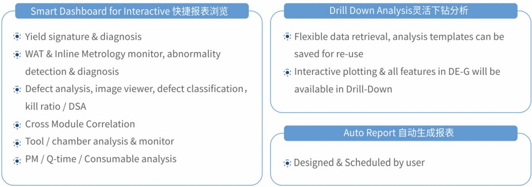 系统通过特有的算法支持和合理的数据处理流程,能够快速完成底层数据清洗、连接、整合工作,为Fab和 Fabless企业提供数据管理、良率分析、低良率成因下钻分析等方案。